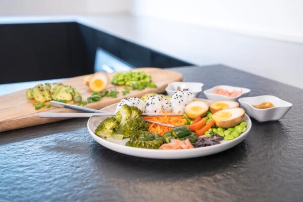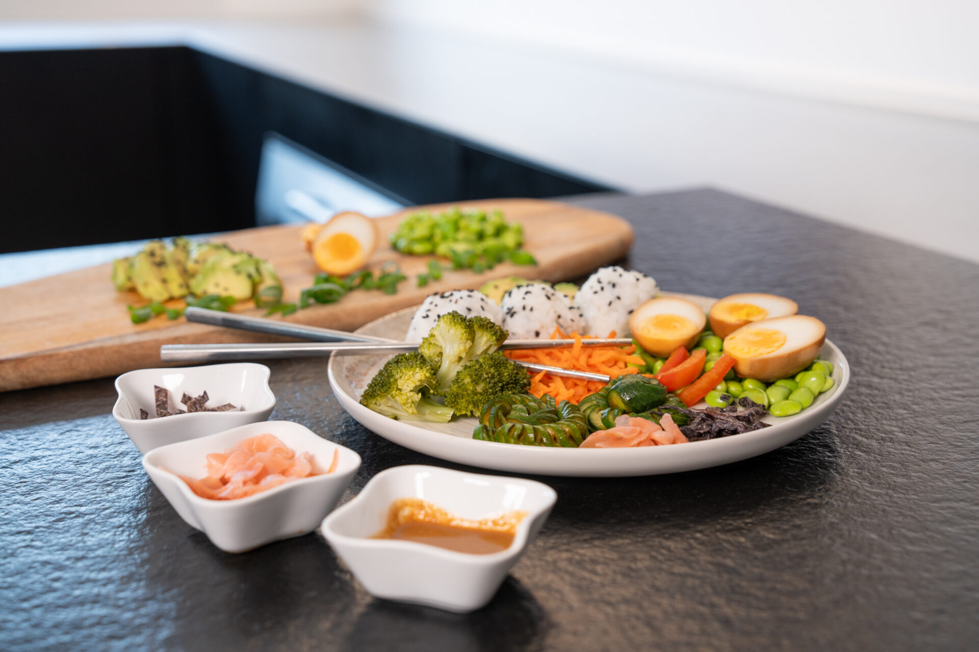 Een kleurrijke bowl vol frisse knapperige groenten, romige avocado, edamame en zachte sushirijstballetjes. De gemarineerde miso-eieren zorgen voor een rijkelijke umami-boost, terwijl crunchy toppings als sesam en nori het geheel afmaken. Een gebalanceerde, voedzame maaltijd met alle smaken van sushi – maar dan in een verrassend nieuw kleedje.
