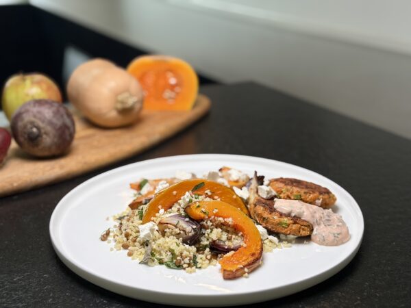 Laat je verleiden door deze verwarmende combinatie van geroosterde flespompoen, kruidige linzen en zoute feta, afgewerkt met frisse kruiden. Daarbij krijg je zachte volkoren bulgur en twee smeuïge huisgemaakte zalmburgers vol smaak. Een pittige yoghurt-limoensaus zorgt voor de perfecte balans. Deze bowl zit boordevol kleur, smaak en feelgood vibes – jouw gezonde glow in één maaltijd.