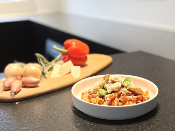Geniet van een hartverwarmende portie volkoren pasta al dente in een rijke en smaakvolle kerstomatensaus met malse, gegrilde kipfilet, verfijnd met vers basilicum. Afgewerkt met geraspte Parmigiano voor die typische romige, hartige toets. Een stevige en smaakvolle maaltijd die de warmte van de Italiaanse keuken combineert met pure voeding — perfetto na een actieve dag of als energieke lunch.
