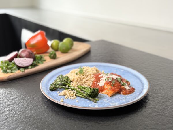 Zachte witte vis in een pittige tomatensaus met een vleugje gerookte paprika, gecombineerd met tarwe granen en frisse bimi. De tahin en koriander geven dit gerecht een romige en kruidige diepte. Een voedzame maaltijd met een verrassende mix van smaken, perfect om even helemaal van op te warmen.